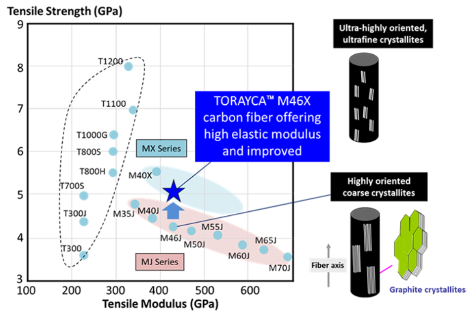 Torayca™ M46X的成功开发是东丽碳纤维结构控制技术的又一次突破。该产品纤维内部纳米尺度石墨晶体达到了晶粒超细、取向超高的程度,从而使宏观纤维拉伸强度提升20%以上,同时保持了极高的拉伸模量。